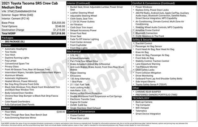 White 2021 Toyota Tacoma SR V6 4D Double Cab 4WD 3.5L V6 PDI DOHC 24V LEV3-ULEV70 278hp 6-Speed Automatic