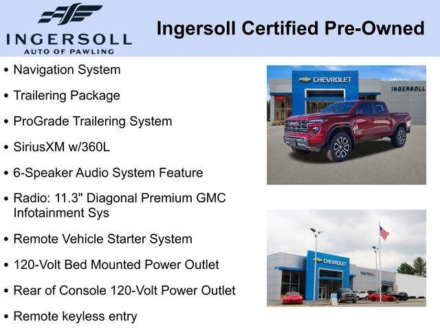 120-Volt Bed Mounted Power Outlet, 2 1st Row USB Charge/Data Ports, 4-Way Manual Front Passenger Seat Adjuster, 6-Speaker Audio System Feature, Apple CarPlay/Android Auto, Auto High-beam Headlights, Automatic Emergency Braking, Automatic Locking Rear Differential, Automatic Stop/Start, Canyon Pro Safety, Driver & Front Passenger Illuminated Visors, EZ-Lift & Lower Tailgate, Following Distance Indicator, Forward Collision Alert, Front Pedestrian & Bicyclist Braking, Heated Driver & Front Passenger Seats, Heated Power-Adjustable Outside Mirrors, IntelliBeam Automatic High Beam On/Off, Interior Overhead Courtesy Light w/Dual Reading Lamp, Lane Keep Assist w/Lane Departure Warning, MultiStow Tailgate, Navigation System, Power Driver Lumbar Control Seat Adjuster, ProGrade Trailering System, Radio: 11.3 Diagonal Premium GMC Infotainment Sys, Rear of Console 120-Volt Power Outlet, Remote keyless entry, Remote Vehicle Starter System, SiriusXM w/360L, Stop/Start System Disable Button Engine Control, Trailering App System, Trailering Package, Wheels: 18 x 8.5 Dark Gray Machined Finish Alum, Wireless Apple CarPlay/Wireless Android Auto.