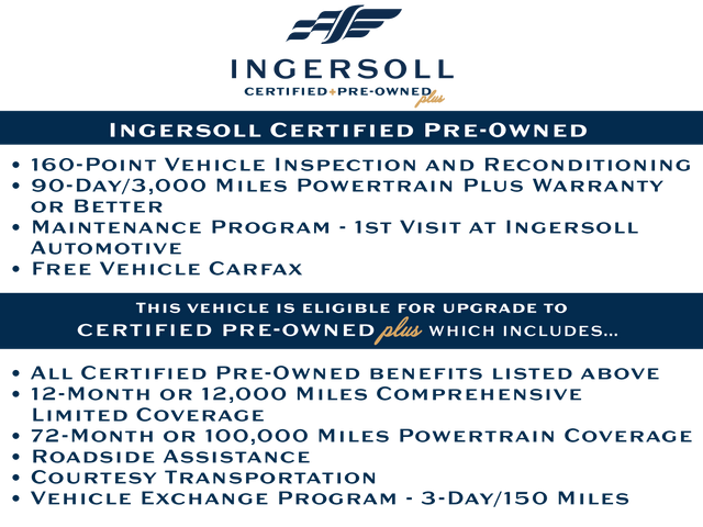 Certification Program Details: This vehicle is being sold as Ingersoll Certified Pre-Owned. This program gives you piece of mind. You will receive. **A Vehicle Inspection and Reconditioning Form. **A Vehicle Carfax. **90 Days or 4000 miles of Powertrain Plus Limited Coverage **A Free Maintenance event including oil change and tire rotation within the first 12mo or 12,000 miles of driving (at an Ingersoll Automotive Location). This vehicle is eligible to be upgraded to Ingersoll Certified Plus for $749. That will give you the additional benefits of 12mo or 12,000 miles of limited exclusionary coverage, 6 years or up to 100,000 miles of powertrain limited coverage (from original in-service date), courtesy transportation for covered repairs, and road side assistance. **A Vehicle Exchange Program if dissatisfied in the first 3 days or 150 miles of ownership. This is not a manufacturer sponsored program